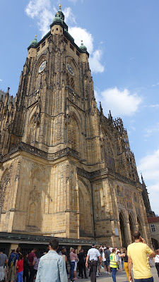 我們從馬提亞斯門這一側進入城堡,經過安檢(檢查背包內部而已)後,就直接去排了聖維特教堂的參觀,人很多排隊隊伍很長,但是聖維特教堂的外觀也有好多地方可以欣賞,那些排水孔、小門、尖塔及拱門的裝飾繁複精緻,除了曬一點,邊看邊移動倒也不覺得排很久。