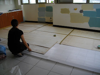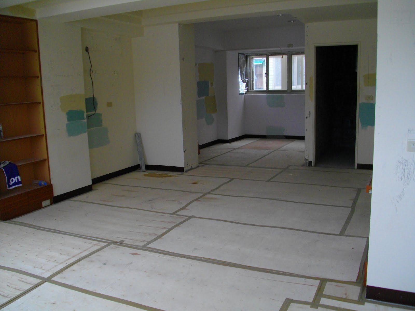 因為後來決定不鋪設木地板,因此原有的地板就需要比較完善的保護,除了瓦楞板之外再加一層木板。
